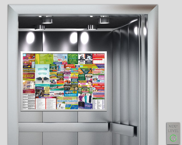Каждый житель многоэтажного дома, как минимум, два раза пользуется лифтом. В замкнутом сером пространстве пассажиры лифта буквально обращают внимание на яркие рекламные стикеры. Регулярность зрительных контактов дает весомый рекламный эффект, знакомит, а затем побуждает потребителя приобрести товар или услугу.
